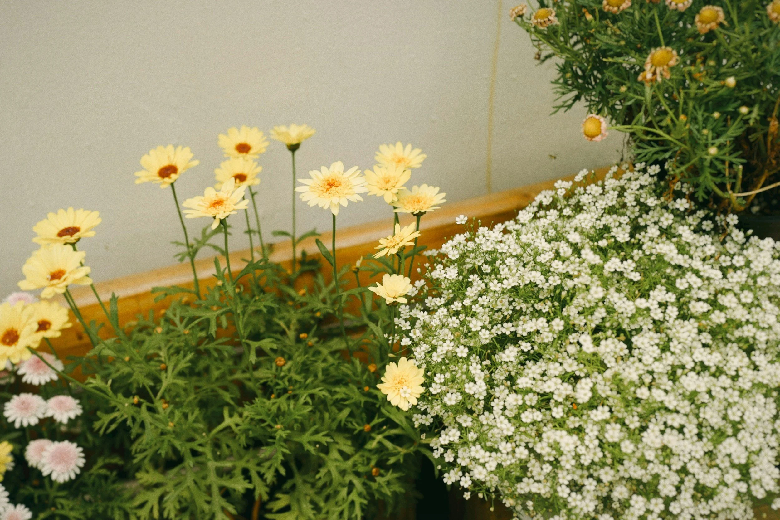 A chic terracotta pot with moss on top and some simple blooms.
